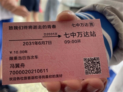 据班主任李菁介绍,返程“车票”实际上是师生之间的十年约定。“我不想高考是终点,所以我们定下了十年之约,高三时同学们就写给了十年后的一封信,十年后,不管他们在哪,我都会把这封信寄给他们。”时间一点一点过去,一堂课很快进入尾声。李菁翻开了名册,开始了高中课堂上的最后一次点名。被点到名字的同学,依次起身说了自己的期望和祝福,随后,同学们走上讲台从老师手中接过返程“车票”,离开了教室。