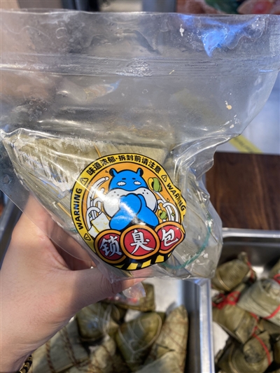 记者注意到,其余单个售卖的粽子仅是用粽叶包裹,而螺蛳粉粽子在粽叶之外,还有一层塑料密封袋包装。包装上写着“锁臭包”,且还有食用注意:“味道浓郁,拆封前请注意”。店内工作人员告诉记者,螺蛳粉粽子是将酸笋、酸豆角、腐竹等螺蛳粉馅料包进粽子里,同时还有螺蛳粉浓汤作为调味,还原螺蛳粉的味道。