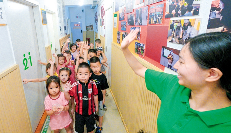 成都高新区二十一世纪幼儿园的老师和同学们挥手再见 本报记者 魏麟潇 摄
