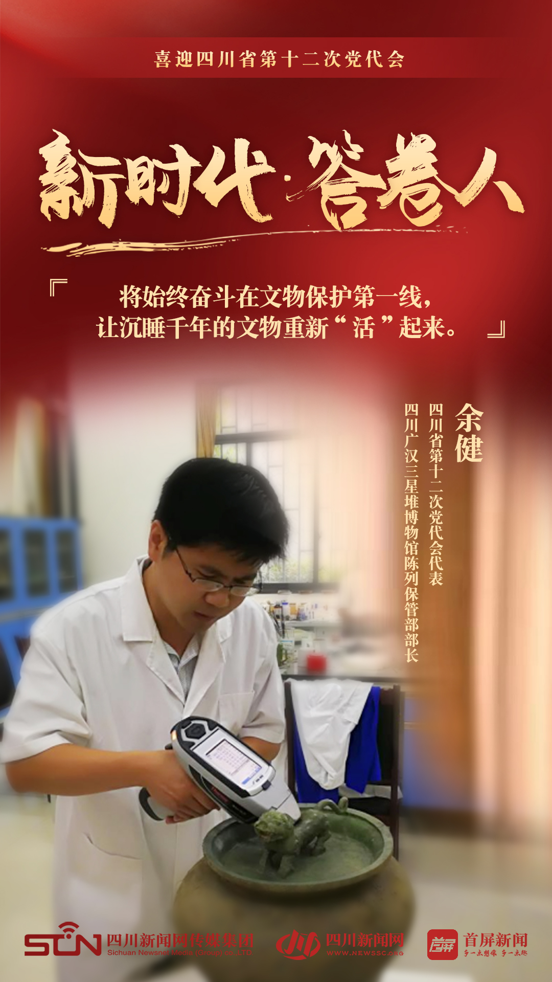 作为四川省第十二次党代会代表,余健希望今后自己能带领团队,继续在文物修复领域上取得更多成绩,为丰富展厅展览、宣传、教育起到积极的作用,开展更多三星堆出土文物的科学研究,提升三星堆博物馆的社会功能与形象,增强三星堆历史文化的影响力和辐射力。