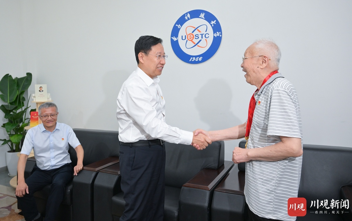 王晓晖还在学校亲切看望慰问党员代表陈杰美、张小松,并为陈杰美颁发“光荣在党50年”纪念章,向两位教授长期扎根教育科研一线作出的贡献表示感谢;来到学校国家电磁辐射控制材料工程技术研究中心调研,希望学校积极融入服务国家战略和四川经济社会发展,打造更多优势学科和重点研究院所,加快推进中国特色世界一流大学建设。