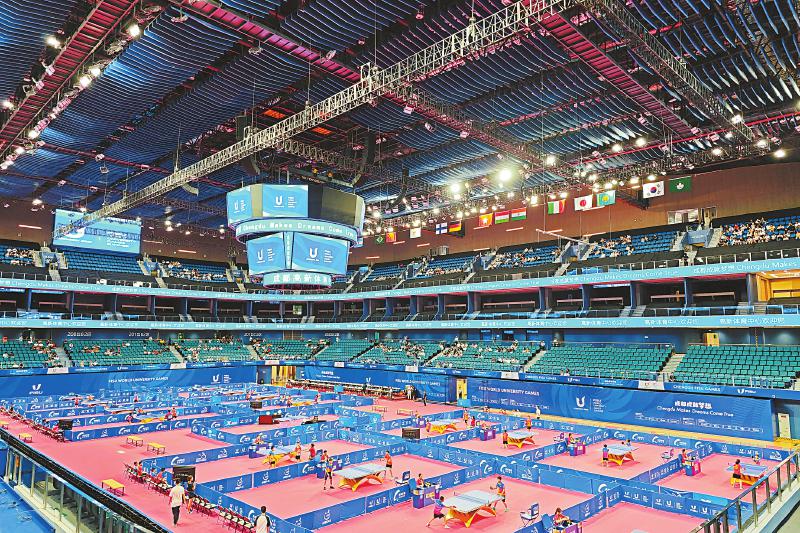 演练中的大运会乒乓球比赛场馆——高新体育中心。 记者 吴枫 摄