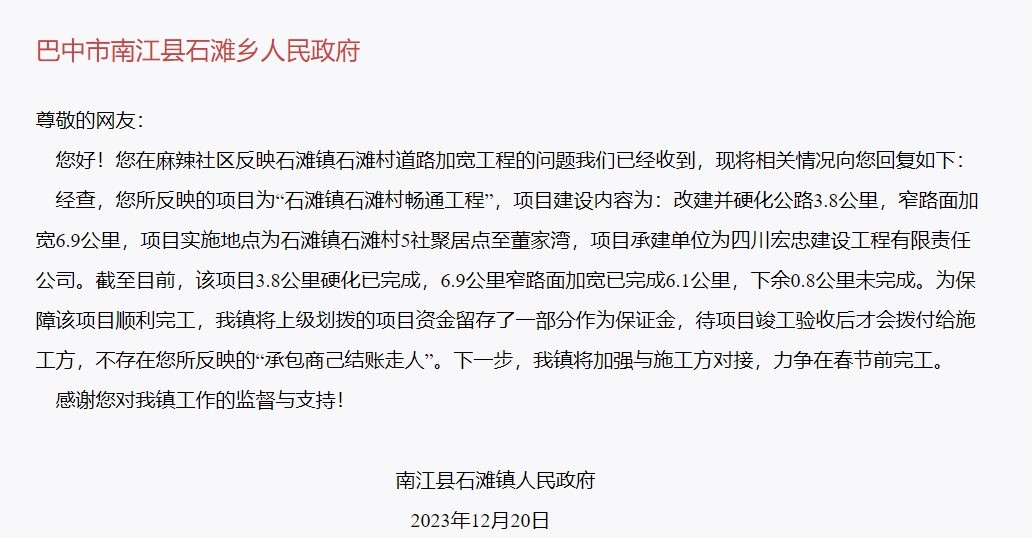 收到留言后,南江县石滩乡人民政府回复称,截至目前,“石滩镇石滩村畅通工程”窄路面加宽已完成6.1公里,下余0.8公里未完成。为保障项目顺利完工,石滩镇留存了一部分项目资金作为保证金,待项目竣工验收后才会拨付给施工方,不存在网民质疑的“承包商己结账走人”。下一步,将加强与施工方对接,力争在春节前完工。