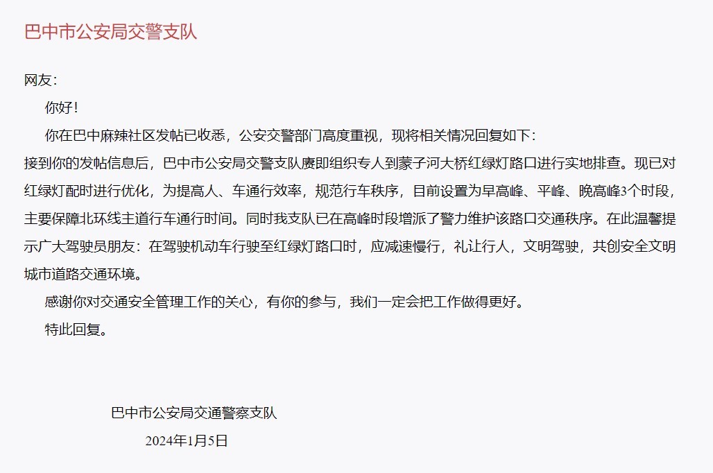 收到留言后,巴中市公安局交警支队回复称,现已对红绿灯配时进行优化,为提高人、车通行效率,目前设置早高峰、平峰、晚高峰3个时段,主要保障北环线主道行车通行时间。同时,巴中交警支队已在高峰时段增派警力维护该路口交通秩序。