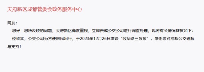 收到网民反映后,天府新区成都管委会回复称,为方便居民出行,公交公司已增设“牧华路三段东”。