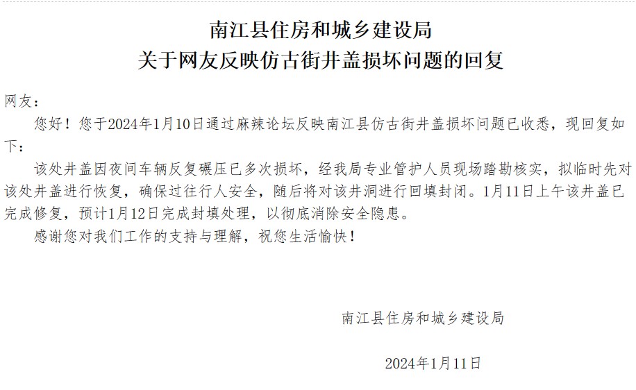 对此,南江县住建局回复称,该处井盖因夜间车辆反复碾压已多次损坏,经过该局专业管护人员现场踏勘核实,拟先对该处井盖进行临时恢复,确保过往行人安全,随后将对该井洞进行回填封闭。1月11日上午该井盖已完成修复,预计1月12日完成封填处理,以彻底消除安全隐患。