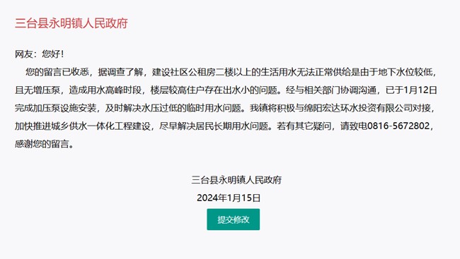 收到网民留言后,三台县永明镇人民政府回复称,建设社区2楼以上的生活用水无法正常供给是由于地下水位较低且无增压泵,造成用水高峰时段,楼层较高住户存在出水小的问题。已于1月12日完成加压泵设施安装,解决水压过低的临时用水问题。