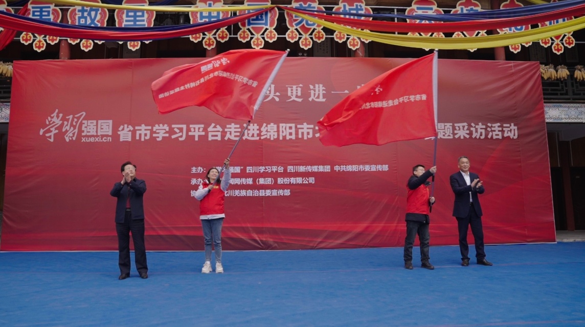 上线仪式现场,中共四川省委讲师团团长、“学习强国”学习平台四川工作办公室负责人傅兆勤,绵阳市委常委、宣传部部长、市总工会主席郑志恒为采访团授旗。杜沣韬 摄