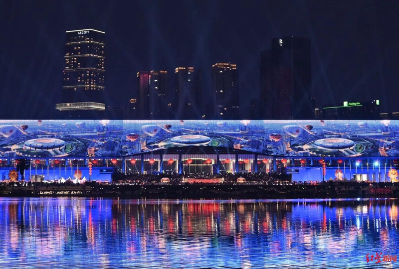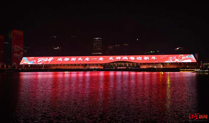 2月9日除夕夜当天,“成都街头走一走,天府画卷迎新年”活动以天府国际会议中心数字大屏为舞台,呈现精彩纷呈的奇幻数字艺术文化内容。依托高精尖的数字多媒体技术,数字长屏与秦皇湖喷泉灯光、舞火龙、打铁花、无人机表演、万人大合唱等表演交相呼应,线上线下联动,打造别致的除夕跨年主题夜。