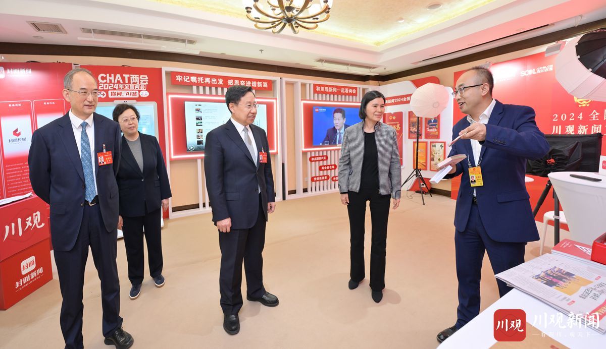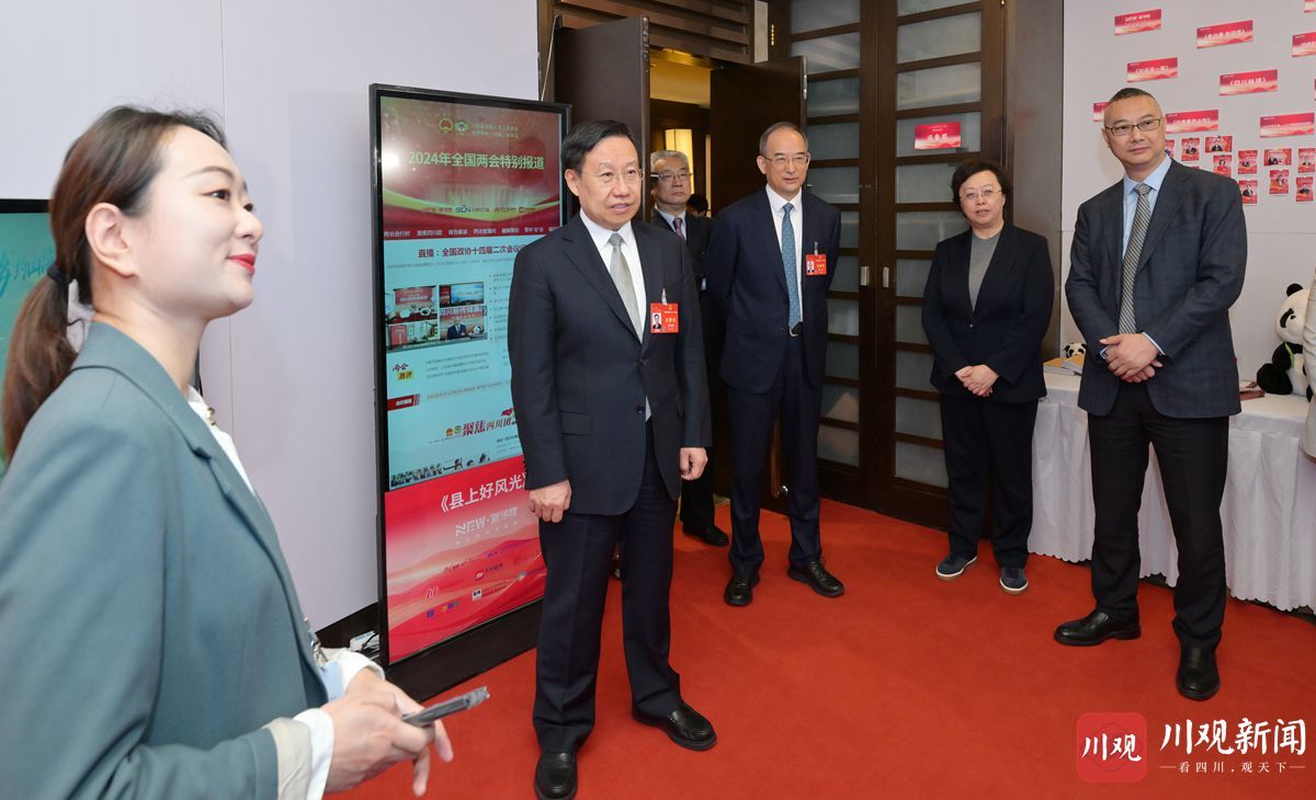 王晓晖、黄强先后来到四川日报报业集团、四川广播电视台和四川新传媒集团设在驻地的演播厅,听取各媒体宣传报道总体情况介绍,详细了解重大主题报道、重点选题策划、人工智能技术赋能产品创新等情况,并饶有兴致地察看全国两会报道作品、特色文创产品展陈等。王晓晖对中央有关媒体和我省主要媒体全国两会宣传报道取得的阶段性成效给予肯定,对大家的辛勤付出表示感谢。他说,今年全国两会,是在新中国成立75周年、实现“十四五”规划目标任务的关键一年召开的重要会议,举国关注、举世瞩目。连日来,大家聚焦大会主题,紧贴民生关切,充分发挥媒体融合优势,坚持会内会外紧密结合、北京四川时时联动、前线后方密切配合,推出了一批有深度、有温度、有力度的新闻报道,全面反映了大会盛况,展示了代表委员履职风采,展现了全省上下朝着全面建设社会主义现代化四川阔步前行的奋进姿态。希望大家发扬连续作战精神,再接再厉、善始善终做好各项报道工作,为全国两会圆满成功营造浓厚氛围。