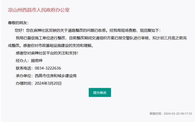 收到市民反映后,凉山州西昌市住房和城乡建设局回复: