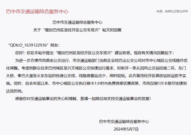 近日,巴中市巴州区的市民张先生在“群众呼声-四川省网上群众工作平台”反映,巴州区往经开区巴中东站的公交班次较少,高铁开通后乘客的需求会增大,希望增加相关班次。巴中市交通运输综合服务中心回应称,待高铁投运后拟新开一条快速公交线。