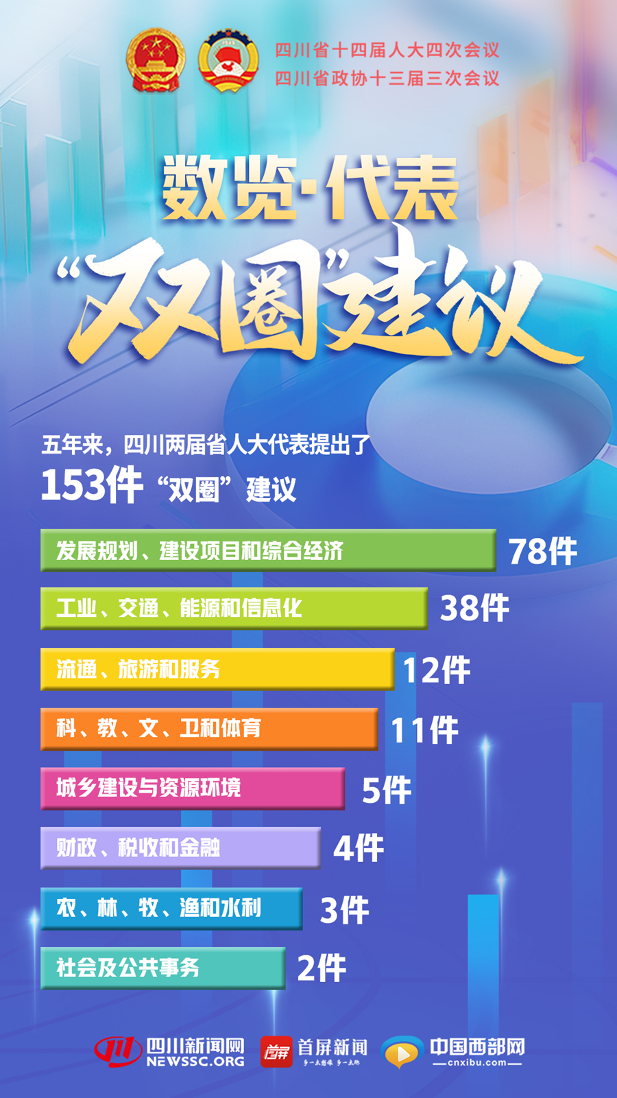 根据四川省人大代表工作委员会统计,5年来,代表们提出的关于成渝“双圈”发展规划、建设项目和综合经济的建议有78件,被提及的最多最频繁;关于工业、交通、能源和信息化的相关建议有38件,家门口的那条路,因为“双圈”建设变得四通八达。流通、旅游和服务提了12件,科、教、文、卫和体育提了11件……