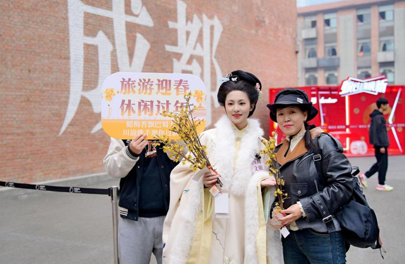 工作人员在成都东郊记忆为游客送上蜡梅花(图片由省文旅厅提供)