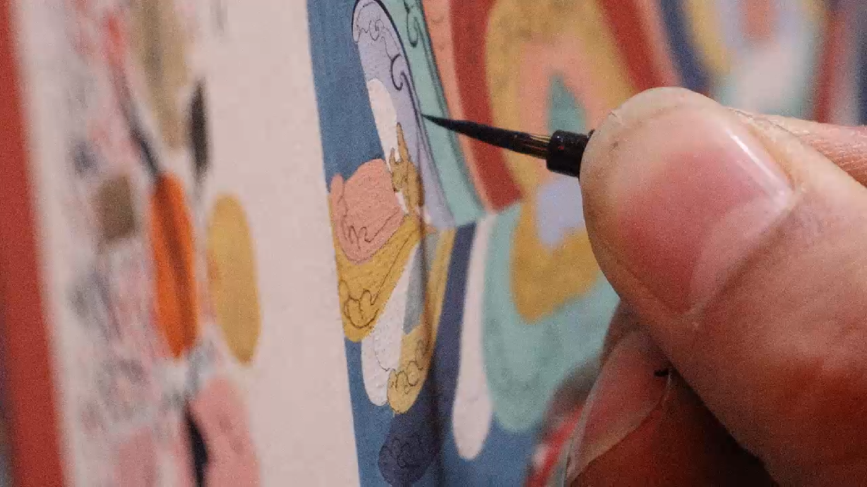 28岁的泽仁单真,作为唐卡艺术的年轻传承者,自幼研习“勉唐画派”与“嘎玛噶孜画派”等传统画派,他不仅深谙传统精髓,更勇于创新。通过将当代素描技法与“点派唐卡”技艺相结合,泽仁单真以密集点状笔触取代传统平涂与晕染,创造出独特的立体颤动与光影流动效果,使这一新唐卡流派广受瞩目。此外,他还突破传统载体限制,巧妙利用落叶、石头、木头等自然材料,赋予唐卡艺术新生,并通过设计轻量化文创产品,使千年唐卡艺术跨越地域界限,融入更多人的日常生活。