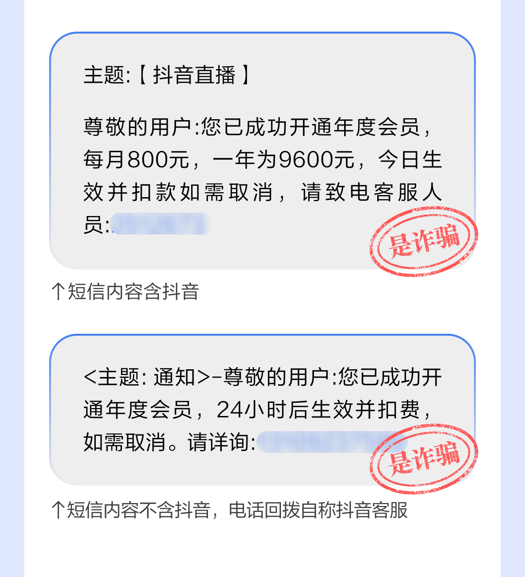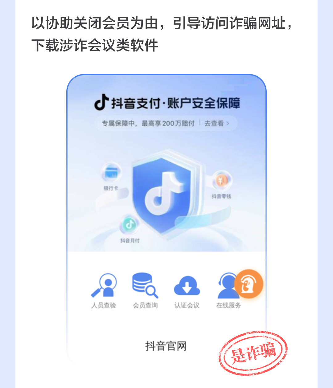 近期,有不法分子冒充抖音,以“关闭直播会员”“关闭电商会员”及“关闭百万保障”等名义实施诈骗。抖音声明,此类“官方”通知均为诈骗行为,请大家谨慎辨别。