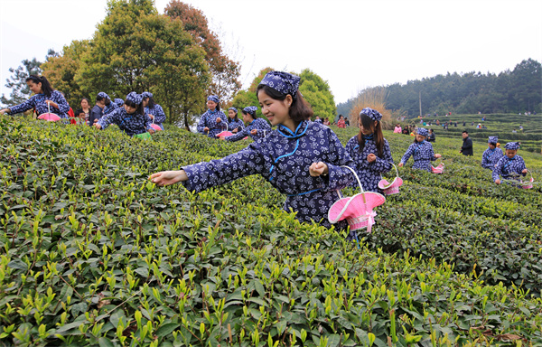 3月23日,晴空万里,在平昌县三十二梁茶园里,来自达州市通川区的游客们,身穿青花衣衫,头戴青花头巾,腰挂小竹篓,正体验茶叶采摘,或歌或舞,其乐融融。