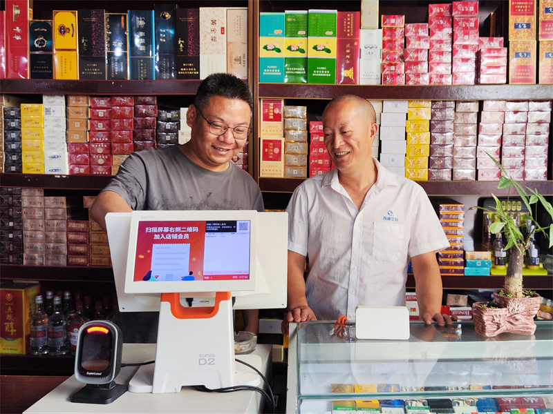 烟草客户经理赖波(左)为黄明清培训库存盘点