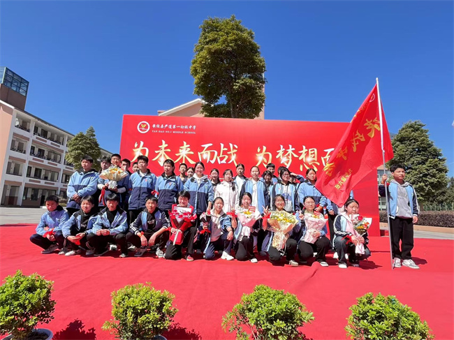 感恩环节中,班主任们为学生送上暖心鼓励,学子们向老师鞠躬致谢,家长与孩子深情相拥。授战旗仪式将活动推向高潮,校长向各班授予象征荣誉与责任的战旗,班主任挥旗引领学生呐喊冲锋。