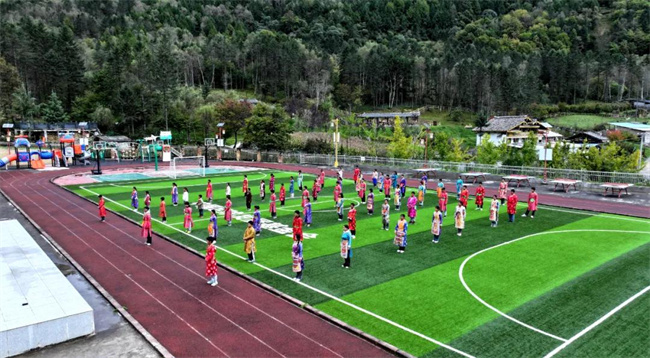 当悠扬的民族音乐响起,159名身着藏袍的学生在雪山环抱的操场上翩然起舞。近年来,宝兴县硗碛藏族九年一贯制学校以“藏舞+课间操”的创新融合模式,让民族文化传承与青少年成长同频共振,成为藏乡教育的一道亮丽风景线。