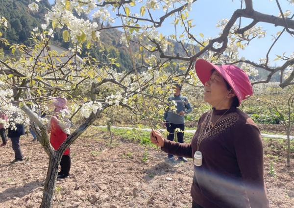 在园区内,村民们也抢抓晴好天气为梨树进行人工授粉。他们手持细长的授粉工具,小心翼翼地将花粉点到每一朵梨花上,确保来年梨产业增产增收。