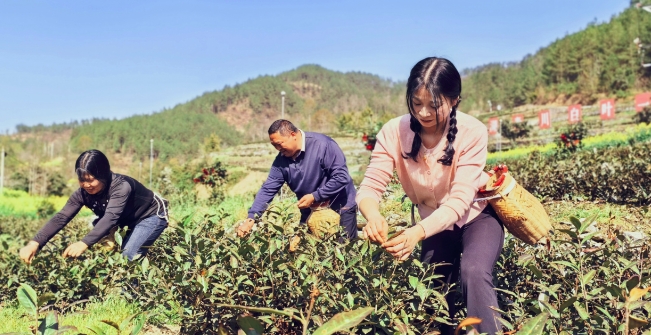 春风和煦,茶山披绿。多名茶农迎着暖阳穿梭于茶树间,指尖轻捻,将颗颗嫩黄芽尖精准采入竹篓,现场洋溢着收获的喜悦。
