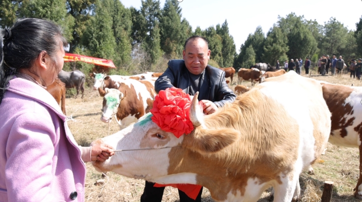 本届牛王争霸赛吸引了70余头本地养殖的西门塔尔、夏洛莱等优良品种肉牛参赛。参赛牛须满足年龄1至3岁、健康无疾病等条件,最终20头牛通过预选赛进入决赛。在锣声与牛叫声中,评委从品种、毛色、肌肉、四肢等维度综合评分,最终4号牛凭借匀称体型和健硕肌肉摘得桂冠,头戴大红花的“牛王”威风凛凛,赛事共评出一二三等奖及17名优秀奖。参赛村民唐琼英激动地表示:“感谢乡政府的支持,今后要更用心地养牛,把产业做大!”