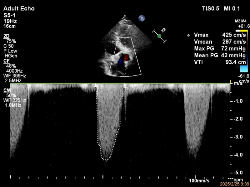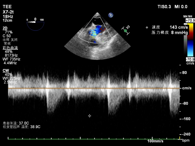 一切准备就绪后,手术按计划实施。由张海波教授主刀,在心脏大血管外科副主任刘仕强、陈旭主任医师、王永杰副主任医师的辅助下,在手术室、重症监护室的密切配合下,团队使用患者自体心包制作成主动脉瓣瓣叶,顺利完成Ozaki手术。术中超声可见自建主动脉瓣开关良好,未见狭窄及反流,Vmax:1.4m/s,Max PG:8mmHg(图2)。