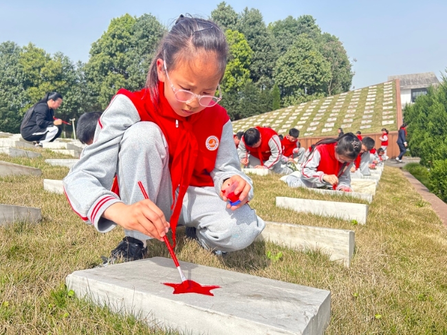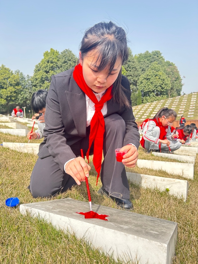 在红军烈士墓旁,参加活动的全体人员自发拿起描笔,为烈士墓碑上五角星描摹红色的朱漆。“以我之笔,描您英名”,这一抹红色穿越历史,鲜亮如昔,以实际行动向英烈致以崇高的敬意,表达继承先烈遗志的坚定决心。