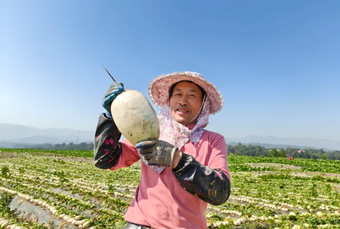 在樟海镇永乐村的农田里,村民们正热火朝天地收萝卜,忙碌的身影穿梭其间。“我们在樟海镇永乐村流转了1200亩土地,每亩产值4000元左右,咱们这个萝卜可是上午挖出来下午就在去往成都、北京的路上喽!”萝卜地承包商胡老板说道。